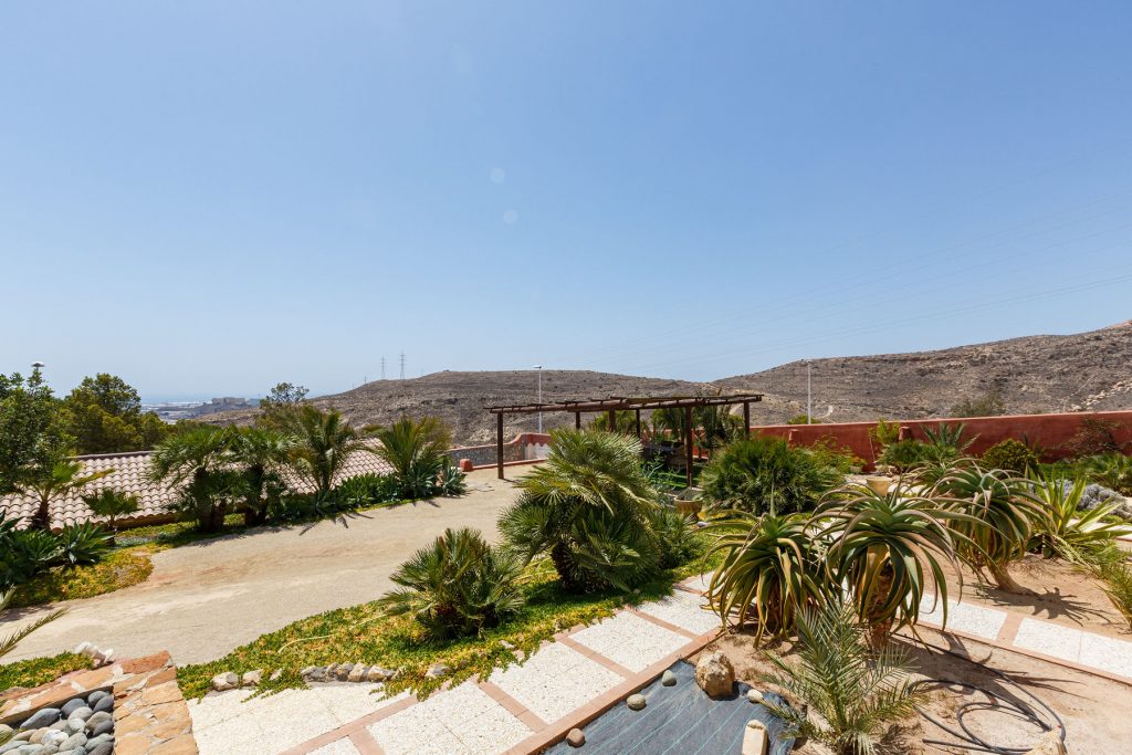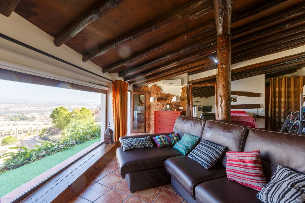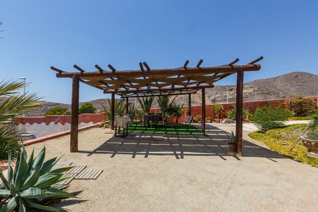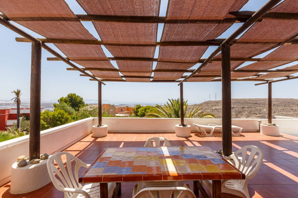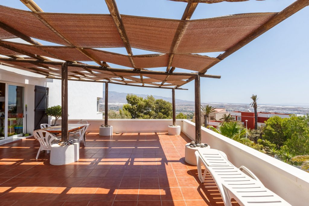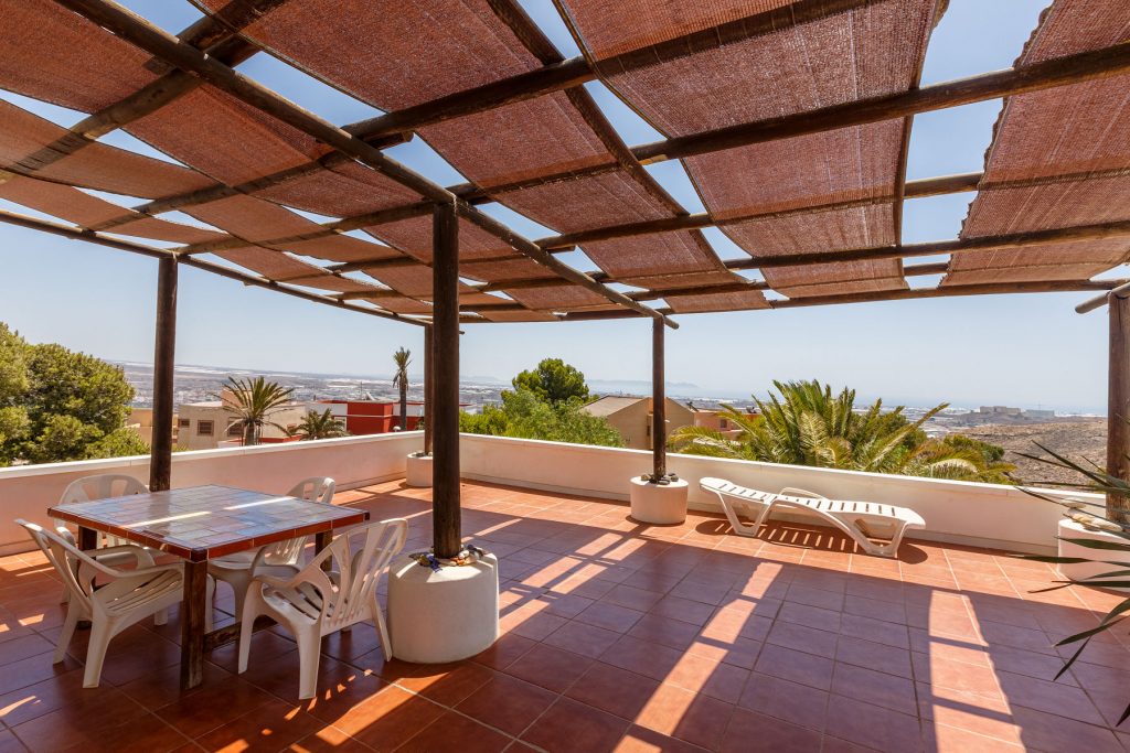 Compuesta por entrada-escaleras helicoidal de mármol, 2 dormitorios de matrimonio (con armarios empotrados), 1 baño completo, 1 amplio salón-comedor con cocina diáfana, y enorme terraza apergolada (162m2 sobre la cubierta de la casa matriz) con lavadero independiente. Orientación sur-oeste, con magníficas vistas al valle del Andarax y a la Bahía de Almería.