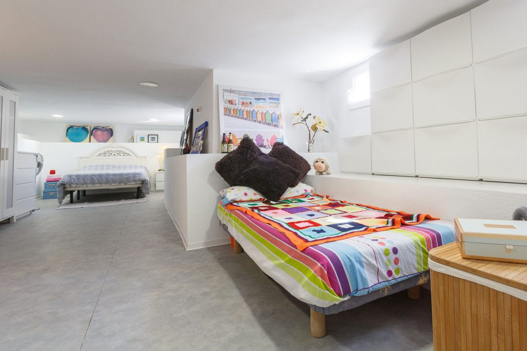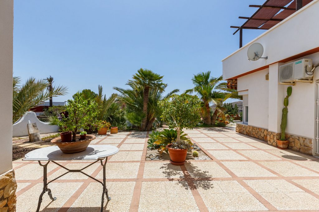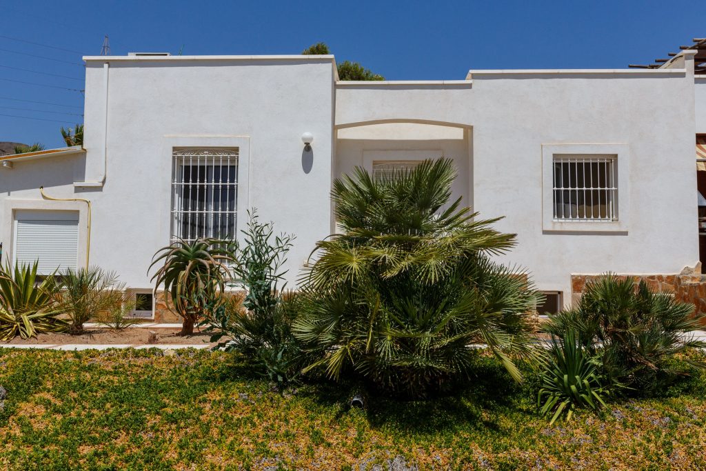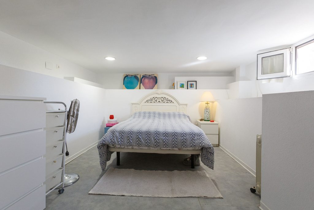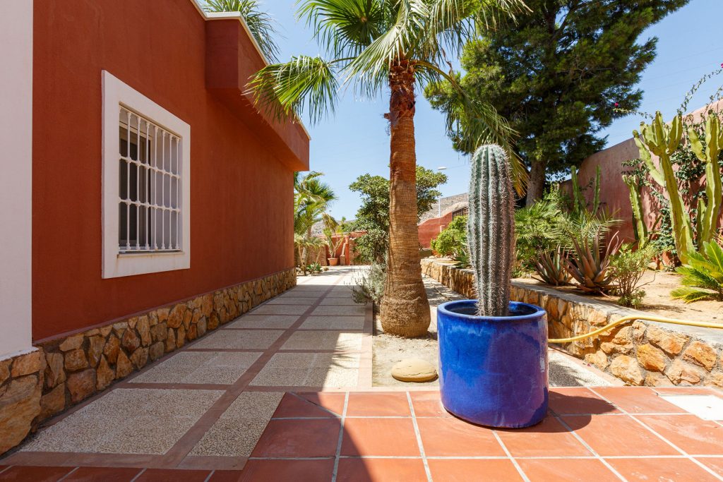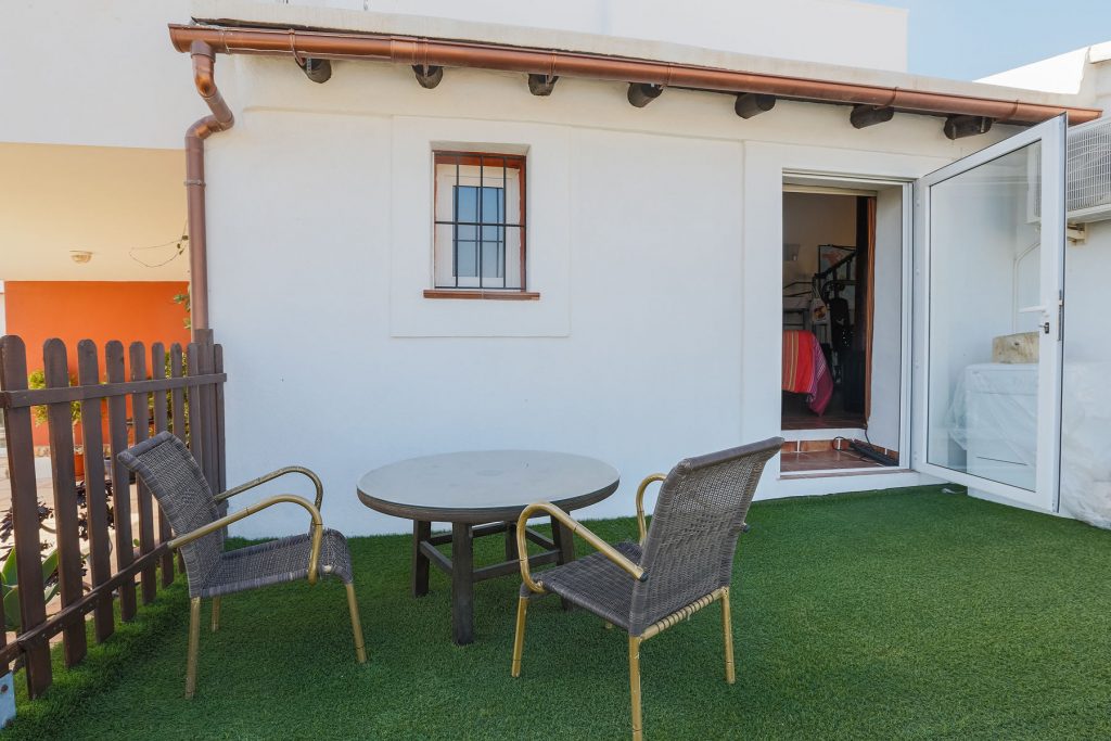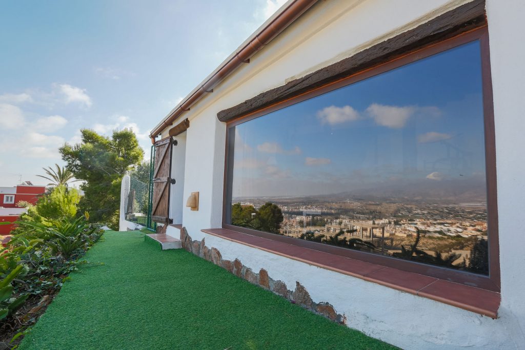 Compuesta por entrada-escaleras helicoidal de mármol, 2 dormitorios de matrimonio (con armarios empotrados), 1 baño completo, 1 amplio salón-comedor con cocina diáfana, y enorme terraza apergolada (162m2 sobre la cubierta de la casa matriz) con lavadero independiente. Orientación sur-oeste, con magníficas vistas al valle del Andarax y a la Bahía de Almería.