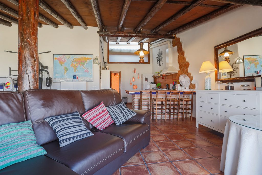 Amplio salón comedor con cocina integrada y dormitorio. Decoración rústica y acogedora.